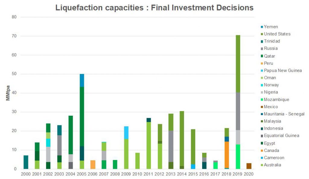 2021 could see a rebound in LNG FIDs as Asian LNG prices jumped to a six-year high in December due to a combination of steady industrial demand in China, cold weather, tight shipping capacity and multiple supply issues. But a tightening of global LNG markets cannot be excluded in the short term if the economic recovery continues and keeps gas demand growth at a steady level in northeast Asia, especially in China. Nuclear and coal phase out plans in Europe could also keep gas-for-power demand steady. On the supply side, we should not see any significant additional liquefaction capacity before 2024, with a second wave of new liquefaction capacities mostly from the US and Qatar. But most additional trains should come after 2025.