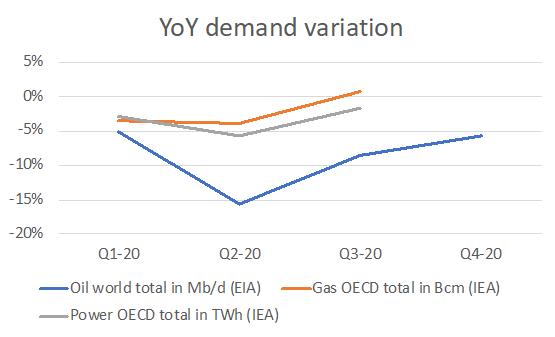 Nevertheless, the impact was clearly less significant for power and natural gas demand compared to oil (see chart) and the recovery from Q3-20 is also slower for oil, notably due to prolonged travel restrictions across the globe. As a consequence, oil prices still remain 20% below their year-opening level in late December.