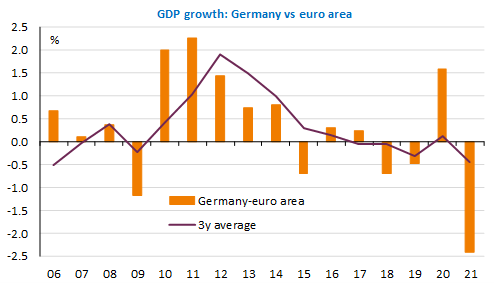 After 16 years in the Chancellery, Angela Merkel left office and her party was defeated in the elections. The new coalition of SPD, Greens and Liberals (FDP) agreed on a programme to accelerate the transition to renewable energies and reduce social inequalities, but without abandoning fiscal orthodoxy. Will it be able to resist these contradictions? The German economy had asserted its dominance over its European partners after the financial crisis. It seemed to be more resilient to the health crisis initially, but has since been overtaken and even surpassed by France and Italy. The automotive sector, the bridgehead of the powerful industry, is being hit hard by the energy transition and the questioning of globalised production chains.
