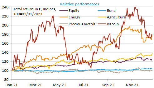 2021 has been the year of crypto-currencies: their total value has almost tripled (about $2300bn today) and investments have diversified. Bitcoin’s market share has fallen from 70% to less than 40%. The performance of Bitcoin over the year as a whole, however, appears disappointing as it does not exceed that of energy commodities and is much more volatile. It is important to choose the right time to invest! However, the value of cryptocurrencies had already exploded by the end of 2020. Compared to the end of October 2020, the value of Bitcoin is up 350%!