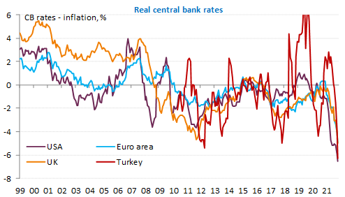 Faced with the persistence of a phenomenon long described as “transitory”, central banks have had to adjust their rhetoric and start tightening their policies. It took them a long time to do so, until they had real key rates as negative as those of the Bank of Turkey! If inflation does not fall as much as they expect in 2022, they will have to raise their interest rates much more than expected today to keep it under control.