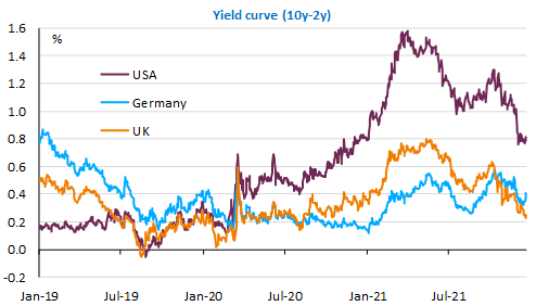 The beginning of 2021 was marked by a sense of euphoria linked to the dissemination of anti-Covid vaccines and the Biden administration’s stimulus plans. The yield curve steepened significantly. This was the “reflation trade”. But this did not last. The markets never really believed in the return of inflation and bet that moderate monetary tightening would be sufficient. The flattening of the yield curve also heralds a significant moderation in activity growth.