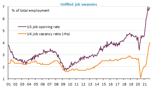 The Covid crisis and its consequences, i.e. the massive use of homeworking and the distortion of the structure and habits of consumption, may have caused major and lasting changes in the labour market. This is especially the case in the US following the sharp rise in unemployment in the spring of 2020 and in the UK where the effects of Brexit have been added to those of Covid. This is less the case in the Eurozone where employment has been preserved by subsidies to companies. There is an unprecedented rise in unfilled vacancies, which is helping to push up wages in some sectors.