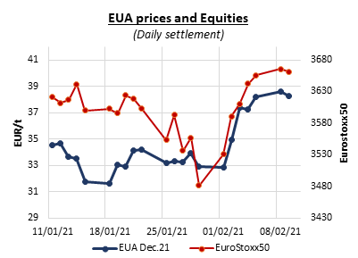 EUAs retreated on Tuesday, dropping below 38€/t to 37.55€/t (-0.71€/t from Monday’s settlement) in the morning amid weaker oil prices, financial markets and energy complex, and forecasts of temperatures rising back above normal next week. The auction held in the morning clearing with a hefty 0.24€/t discount to the secondary market and a low 1.43 bid coverage may have provided additional pressure on the carbon market. After a slight recovery when it reached its 5-day moving average support, the EUA Dec. 21 contract eventually closed at 38.26€/t, -0.35€/t day-on-day and -3.8% from the intraday all-time high of 39.80€/t reached on Monday.
