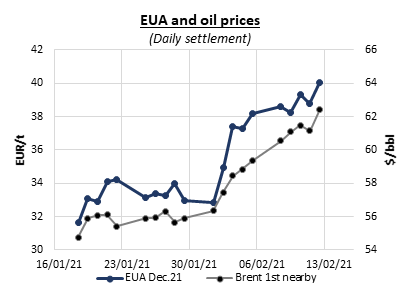 The EUAs opened at 37.69€/t on Friday (-1.07€/t from Thursday’s settlement) and plunged to 37.06€/t over the first minutes of trading due to profits taking following a Bloomberg’s article from the day prior stating that the European Commission is considering limiting speculative trading in the EU ETS. Emissions prices however quickly reverted and rose sharply throughout the day as most market participants agreed that such intervention from the EC is actually unlikely to occur and that the market overreacted to the news. EUAs climbed by 0.70€/t in the aftermath of the morning’s auction which cleared with a massive 2.09 bid coverage (with compliance players likely attracted by the retreat of prices) and hit a fresh all-time high at 40.25€/t in the last hour of trading as a late surge of oil prices provided additional support to the carbon market. The EUA Dec.21 contract eventually closed at 40.02€/t with a hefty 1.82€/t weekly gain.