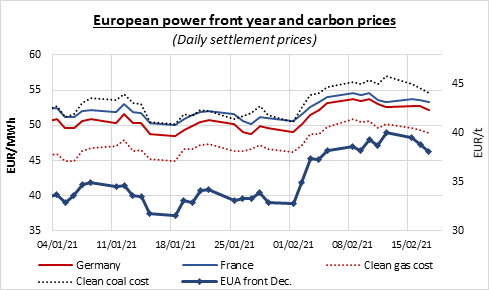EUA prices fell throughout Wednesday, pressured by the weaker equities and energy complex amid mild temperatures curbing the power demand across Europe. Despite this third straight bearish session, some market participants stated that the carbon market could still post some gains in the upcoming sessions by finding support in dip buyers and the nearing April compliance deadline. The morning Polish auction cleared with a 0.11€/t discount to the secondary market and average 1.83 cover ratio. The EUA Dec.21 slightly rebounded mid-day but the move was short-lived and the carbon prices pursued their retreat in the afternoon to eventually settle at 38.09€/t with a hefty 0.77€/t daily loss. Meanwhile, the Commitment of Traders report for last week presented a 4.8mt weekly increase in the investment funds net long position. On the other hand, the companies with compliance obligations reduced their net long position by 24.4mt (-5.1%) to 450.5mt.