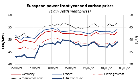 The power curve prices posted hefty gains over the last session of the week, supported by the stronger gas and carbon prices.