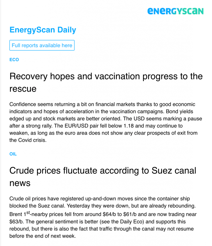 From our daily comment to our weekly and monthly reports focusing on main events impacting financial markets, EnergyScan will offer you synthetic information to identify the key market drivers and challenge your market views.