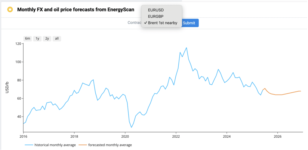 Monthly price forecast for benchmark European foreign exchange rates (EURUSD, EURGBP) and Brent prices